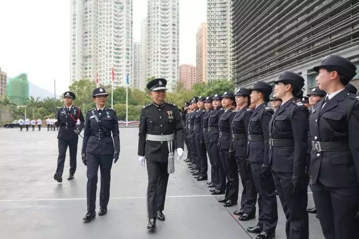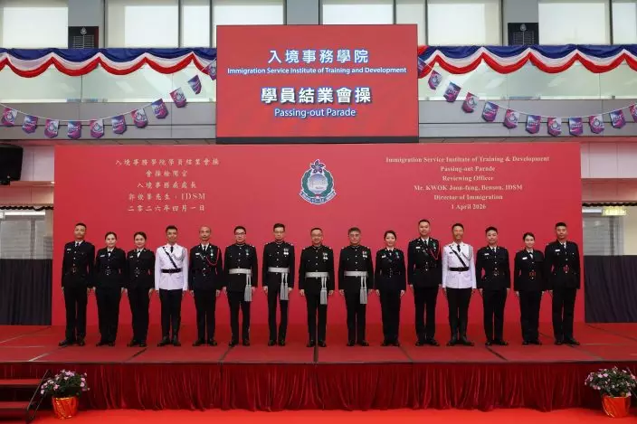The Director of Immigration, Mr Benson Kwok (third left), inspects a contingent of graduates at the Immigration Service Institute of Training and Development Passing-out Parade today (April 1). Source: HKSAR Government Press Releases