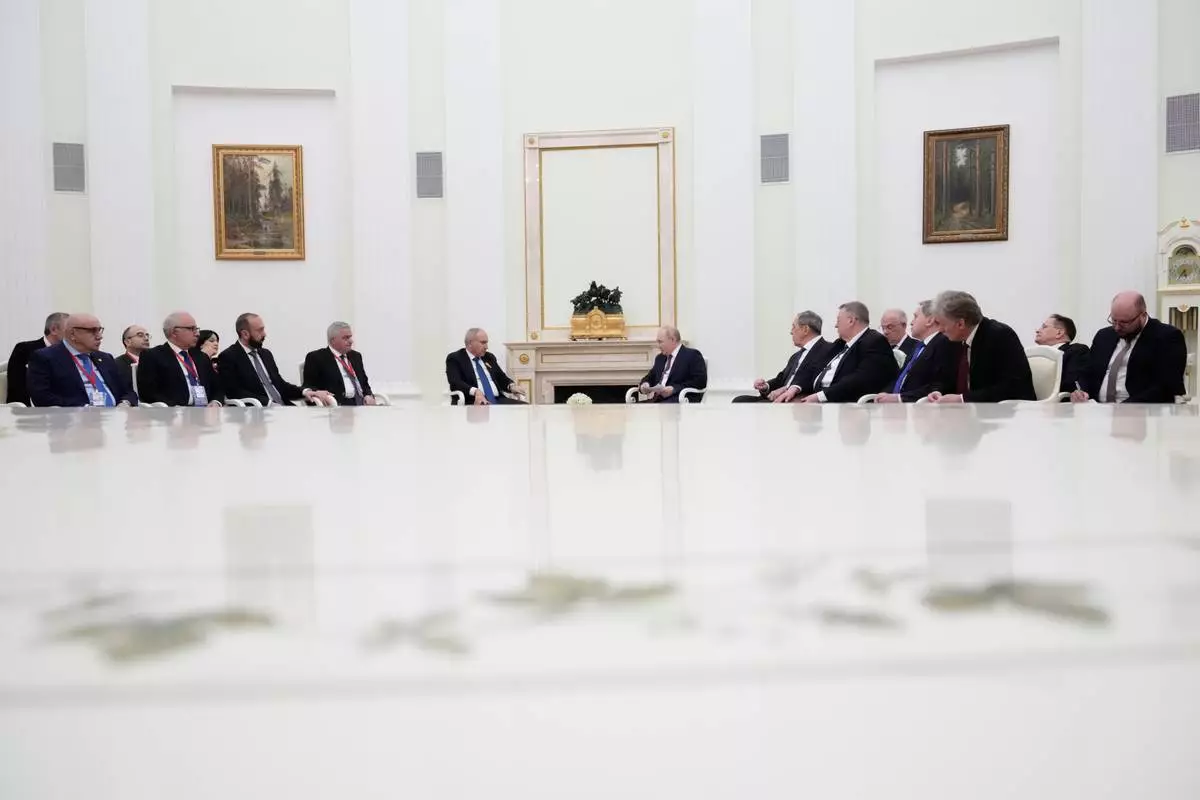 Russian President Vladimir Putin, center right, and Armenian Prime Minister Nikol Pashinyan, center left, hold talks at the Kremlin in Moscow, Wednesday, April 1, 2026. (AP Photo/Pavel Bednyakov, Pool)