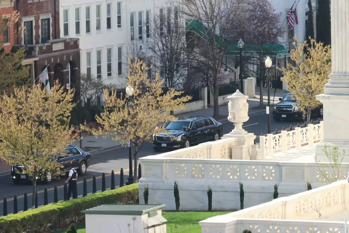 President Donald Trump's limo exits the White House en route to the Supreme Court, Wednesday, April 1, 2026, in Washington. (AP Photo/Mark Schiefelbein)