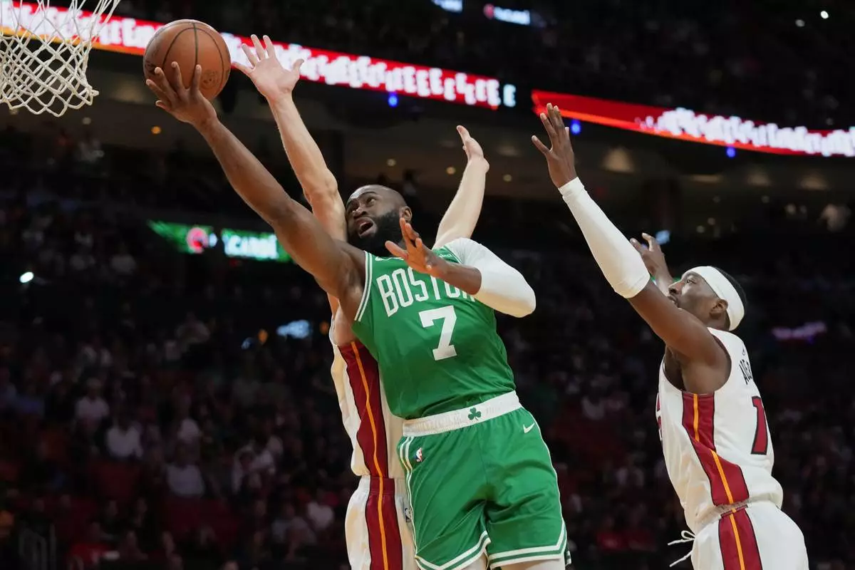 Boston Celtics guard Jaylen Brown (7) goes tot he basket as Miami Heat guard Pelle Larsson, left, and center Bam Adebayo, right, defend during the first half of an NBA basketball game, Wednesday, April 1, 2026, in Miami. (AP Photo/Lynne Sladky)