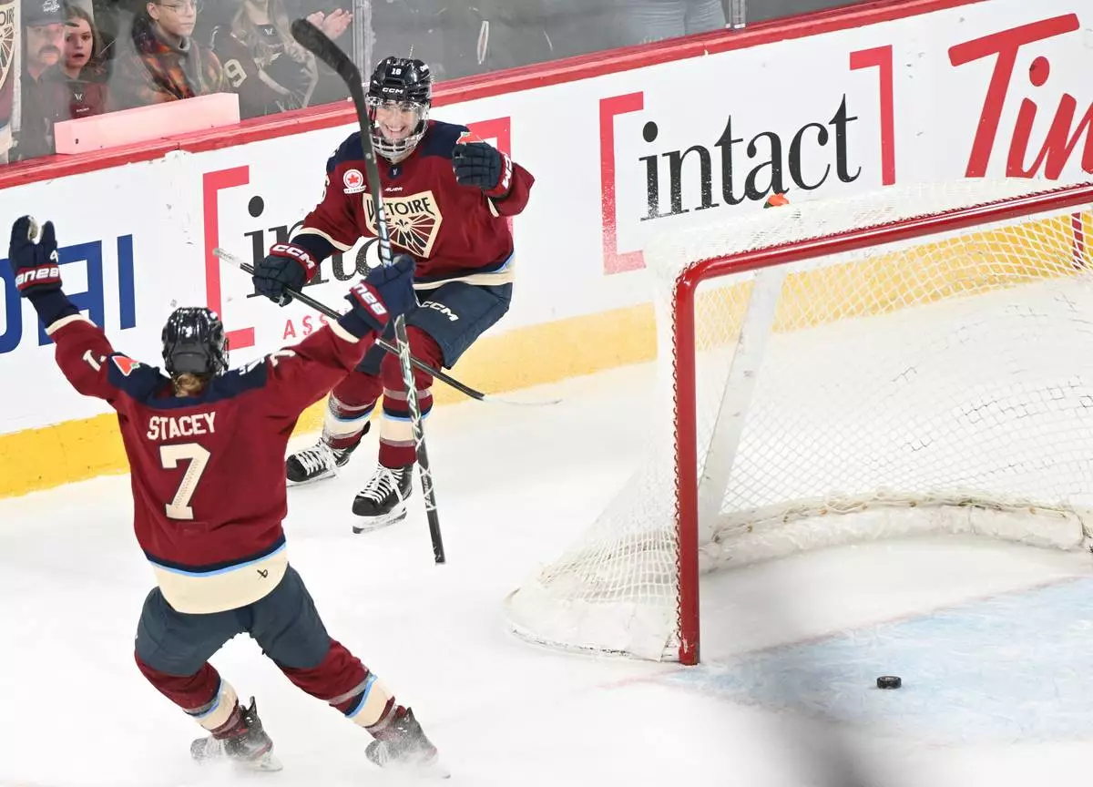 Montreal Victoire players celebrate their win over the Vancouver Goldeneyes in a PWHL hockey game in Laval, Que., Wednesday, April 1, 2026. (Graham Hughes/The Canadian Press via AP)