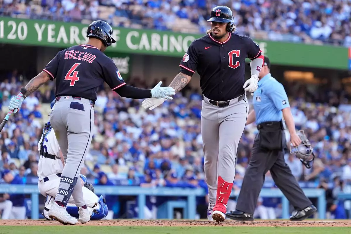 Cleveland Guardians' Gabriel Arias, right, is congratulated by Brayan Rocchio after hitting a solo home run during the third inning of a baseball game against the Los Angeles Dodgers, Wednesday, April 1, 2026, in Los Angeles. (AP Photo/Mark J. Terrill)