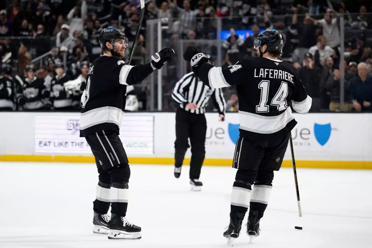 Los Angeles Kings right wing Adrian Kempe, left, and right wing Alex Laferriere celebrate a goal by Kempe during the second period of an NHL hockey game against the St. Louis Blues, Wednesday, April 1, 2026, in Los Angeles. (AP Photo/Kyusung Gong)
