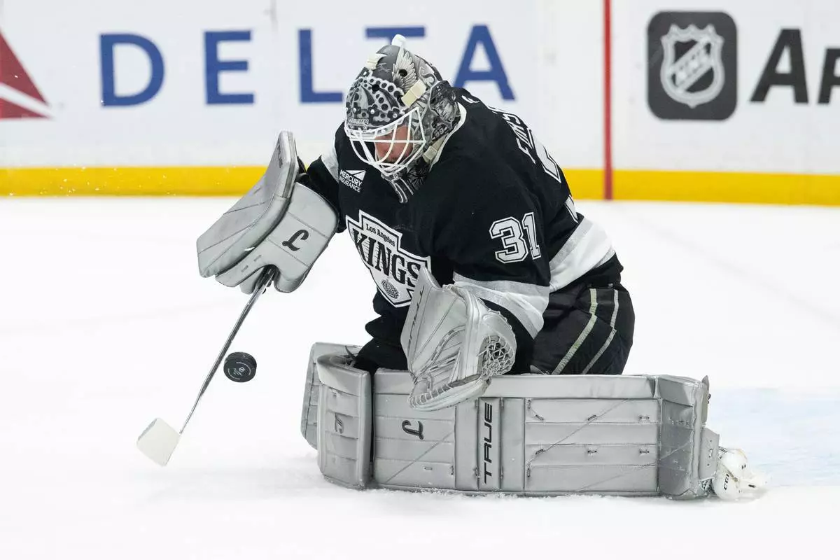 Los Angeles Kings goaltender Anton Forsberg (31) blocks a shot during the first period of an NHL hockey game against the St. Louis Blues, Wednesday, April 1, 2026, in Los Angeles. (AP Photo/Kyusung Gong)