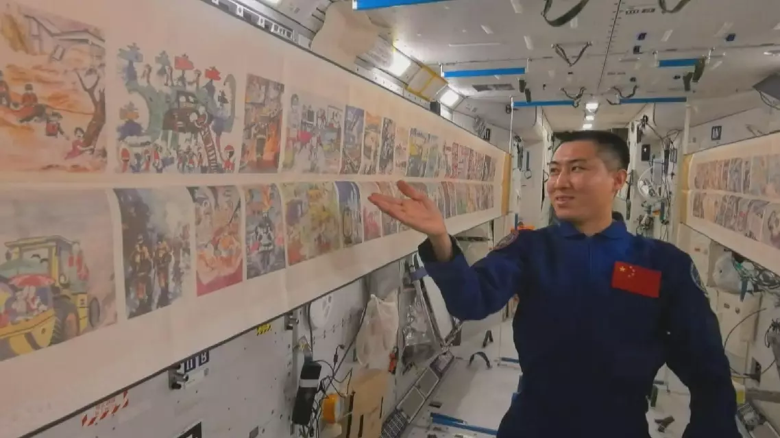 The Shenzhou-21 crew members, comprised of mission commander Zhang Lu and astronauts Wu Fei and Zhang Hongzhang, have displayed and introduced the teenagers' artworks during their mission aboard the space station.