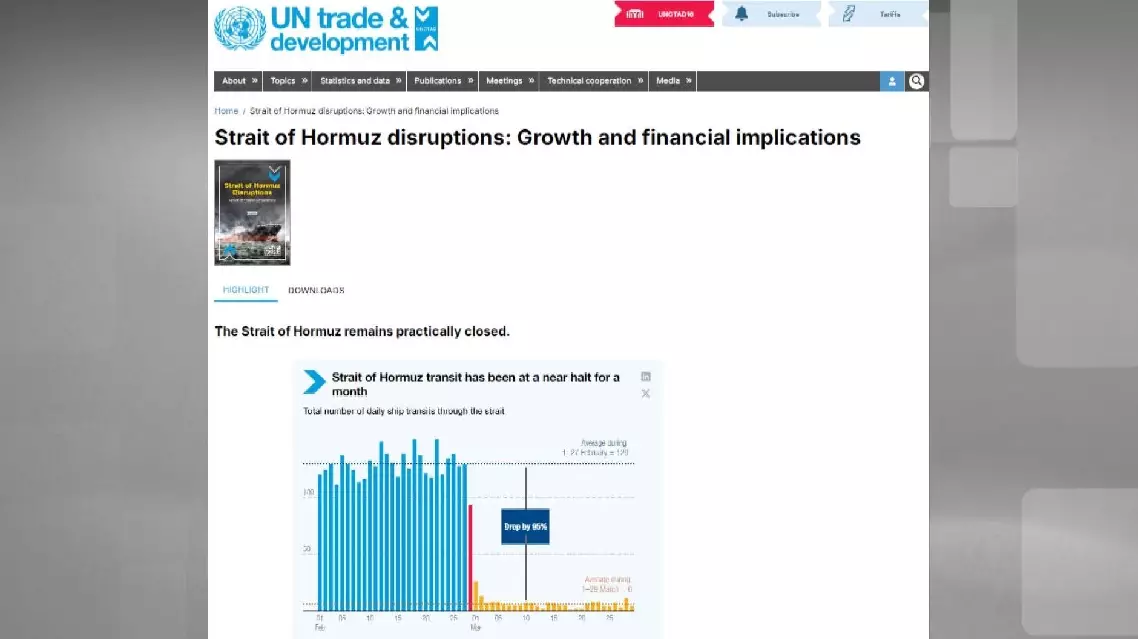 According to the UNCTAD, the maritime traffic through the Strait of Hormuz has fallen by about 95 percent since the U.S.-Israel-Iran conflict, bringing shipping across the strait close to a standstill.