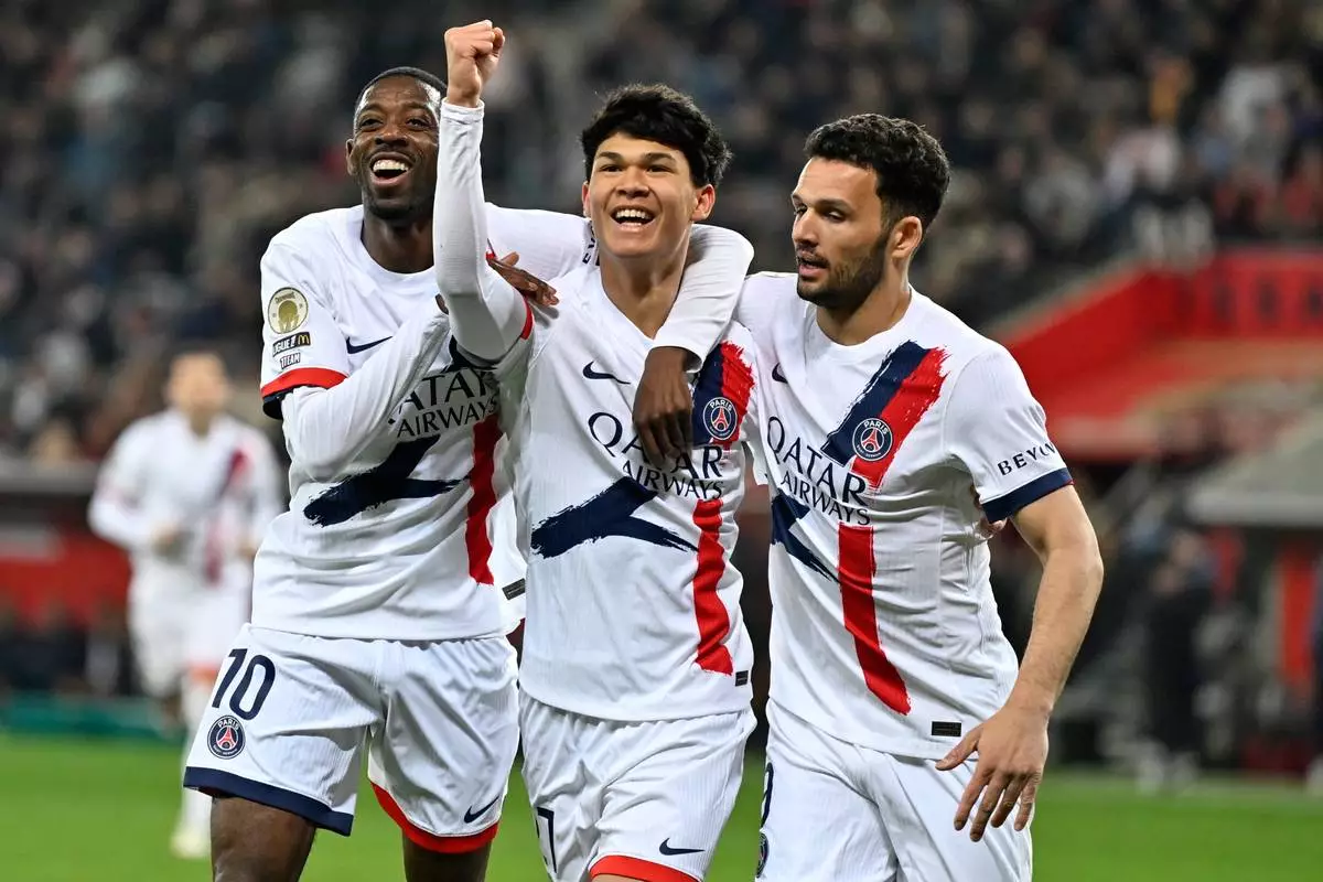 PSG's Pedro Fernandez, center, celebrates after scoring his side's third goal during the French League One soccer match between Nice and Paris Saint-Germain in Nice, France, Saturday, March 21, 2026. (AP Photo/Philippe Magoni)