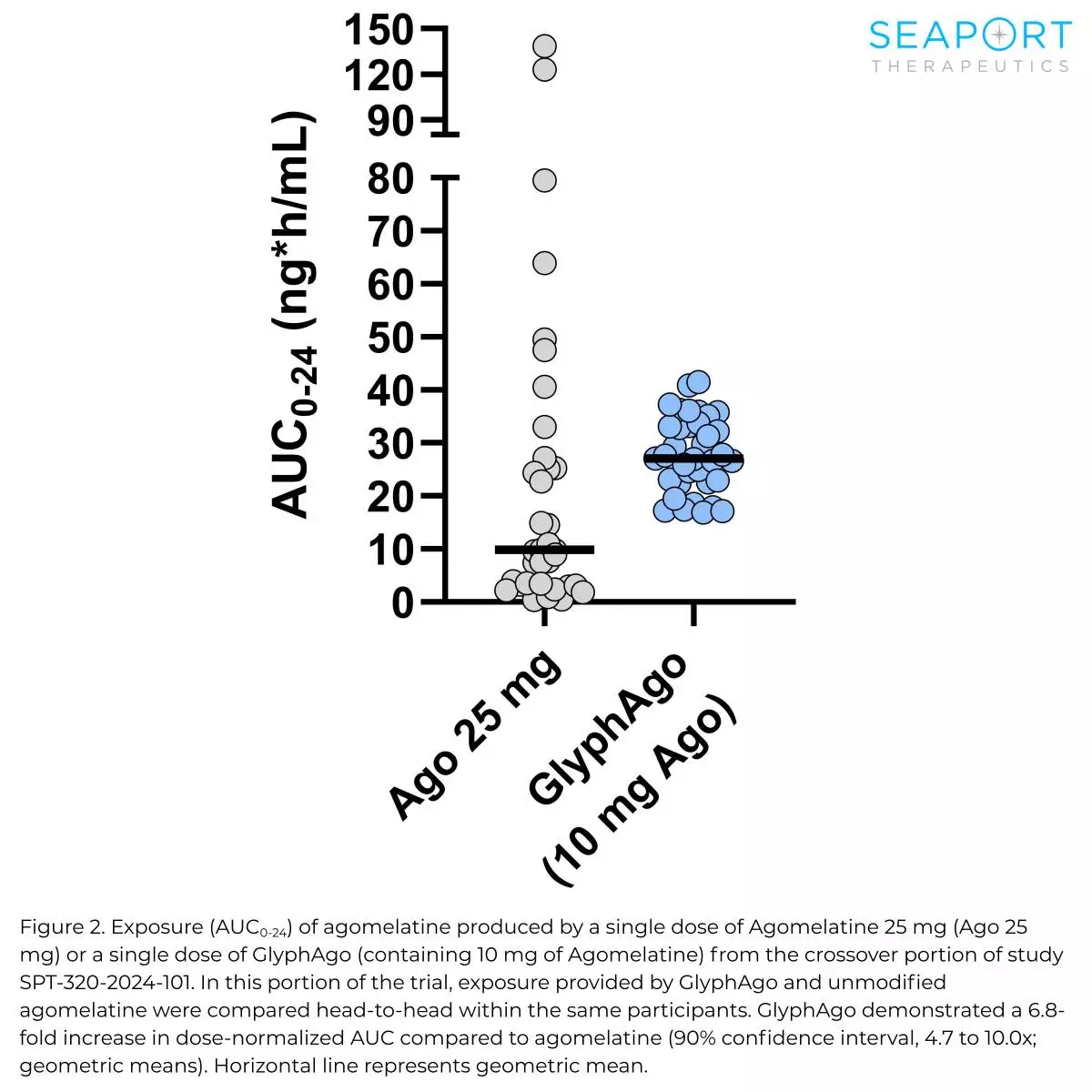 Seaport Therapeutics (“Seaport” or the “Company”), a clinical-stage therapeutics company advancing novel neuropsychiatric medicines with a proven strategy and team, today announced positive topline data from its single-ascending dose (SAD) and crossover portions of its Phase 1 proof-of-concept clinical trial evaluating GlyphAgo™ (SPT-320™ or Glyph Agomelatine), a novel, Glyphed oral prodrug of agomelatine in development for generalized anxiety disorder (GAD). The clinical proof-of-concept topline results demonstrated that GlyphAgo exceeded the program’s target of a 2-fold increase in bioavailability compared to unmodified agomelatine, achieving therapeutic levels of agomelatine at substantially lower doses that reduce liver exposure and are projected to reduce or eliminate the need for liver function testing.