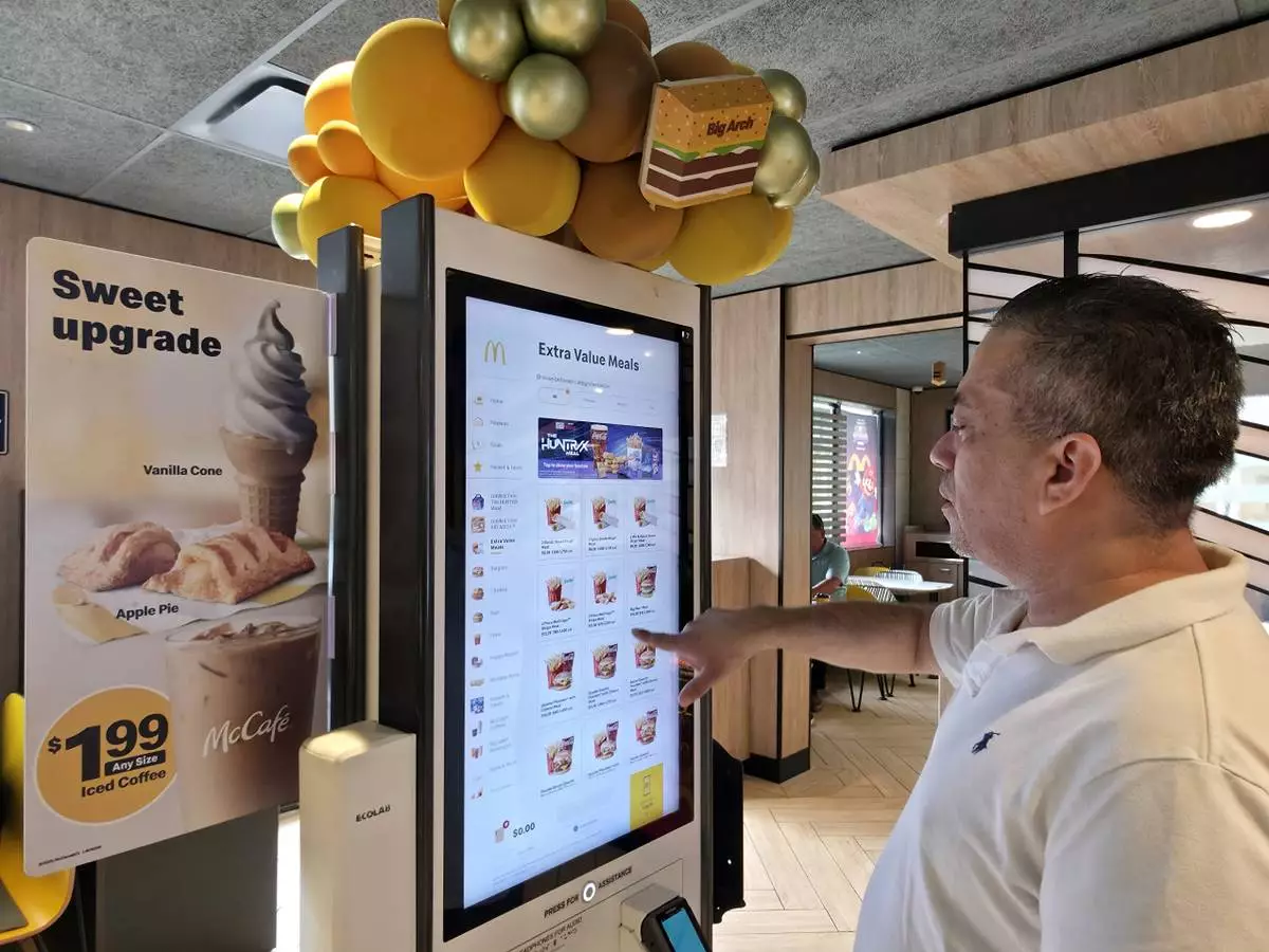 Carlos Paz picks a McValue menu selection at a McDonald's, Tuesday, March 31, 2026, in Los Angeles. (AP Photo/Damian Dovarganes)