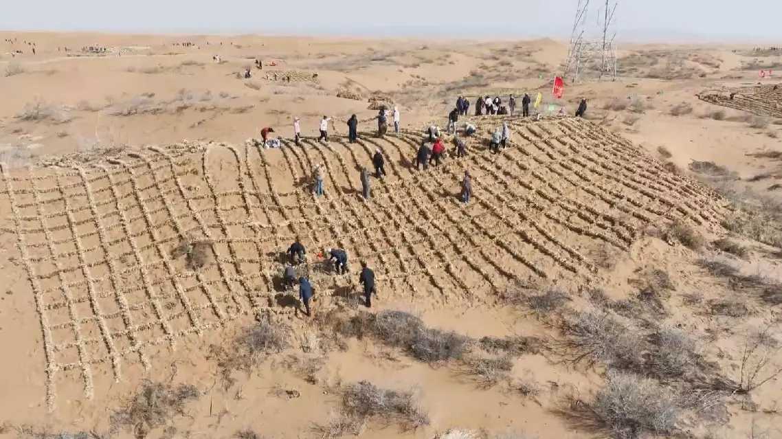 During the event, participants were divided into groups to plant drought-resistant shrubs, sow hardy grass seeds, and build straw checkerboards on the desert surface to stabilize sand and prevent wind erosion. Drones were also deployed to transport straw.