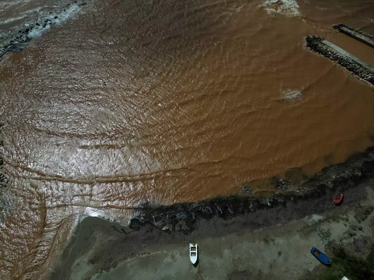 The beach in Marathon, east of Athens, Greece, is seen on Thursday, April 2, 2026, after heavy overnight storms caused extensive damage. (AP Photo/Thanassis Stavrakis)