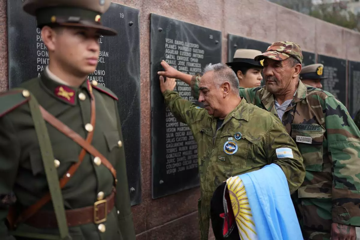 Eduardo Benitez, front, a veteran of the 1982 Falklands War, known in Argentina as the Malvinas, between Argentina and Britain, pays his respects at a monument to the fallen on the anniversary of the start of the war in Buenos Aires, Argentina, Thursday, April 2, 2026. (AP Photo/Natacha Pisarenko)