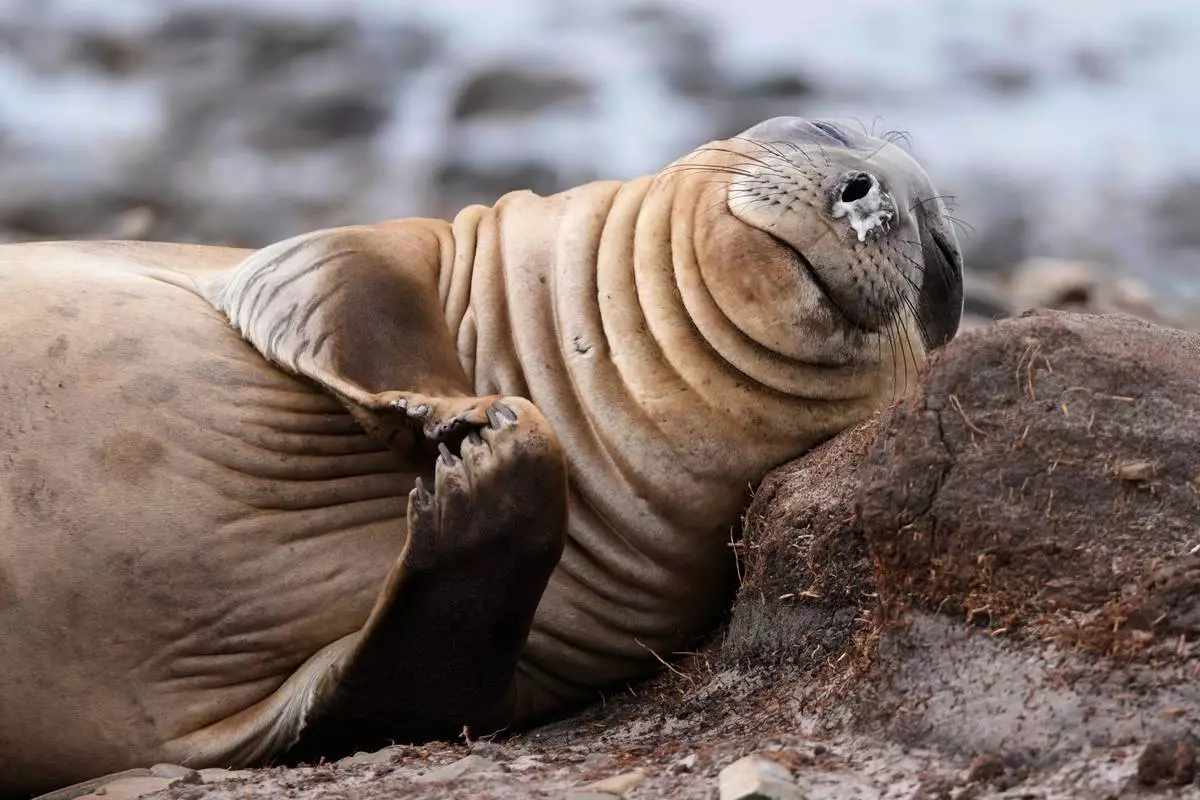 An elephant seal lays on the shore at Kelp Point on the Falkland Falkland Islands, also known as Islas Malvinas, Tuesday, March 17, 2026. (AP Photo/Ricardo Mazalan)
