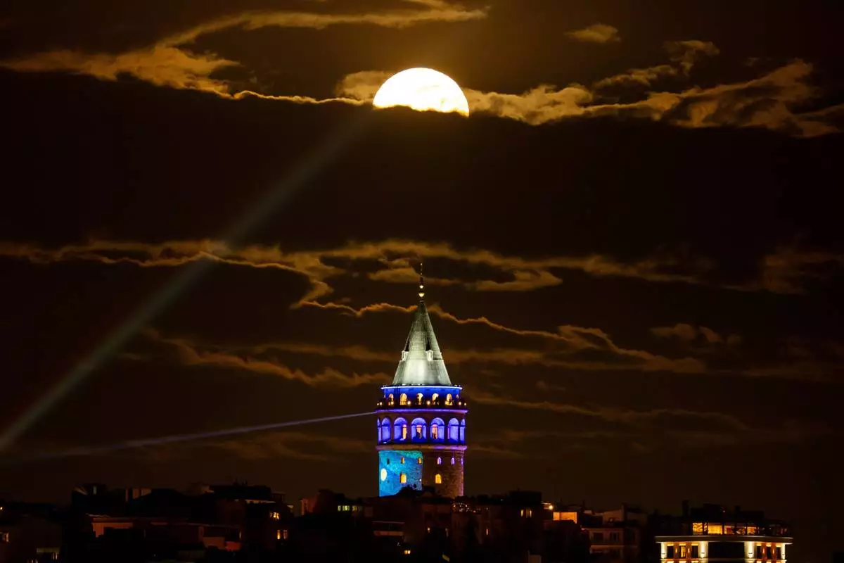 A full moon rises behind Galata Tower, in Istanbul, Turkey, Thursday, April 2, 2026. (AP Photo/Emrah Gurel)