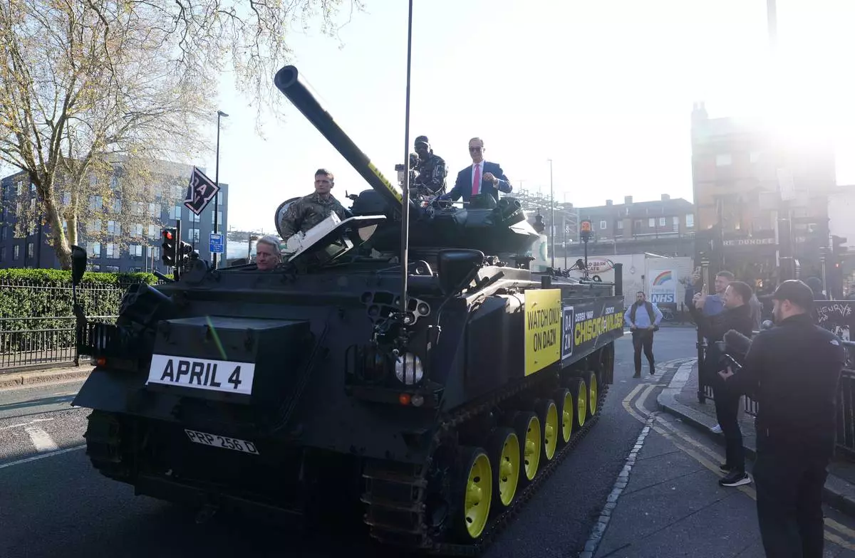 LONDON (AP) — Heavyweight boxer Derek Chisora arrived to a press conference on an army tank alongside British politician Nigel Farage on Thursday.
