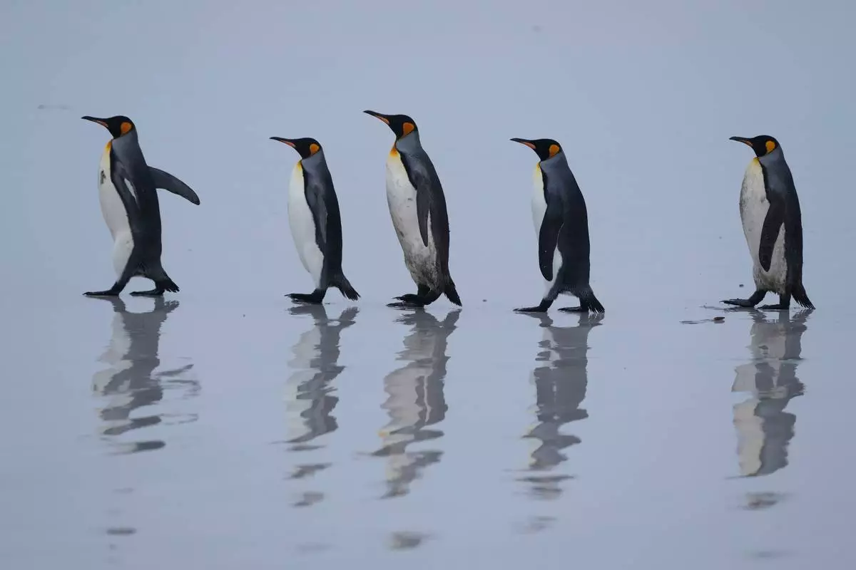 King penguins walk along the shore at Volunteer Point on the Falkland Islands, known also as Islas Malvinas, Thursday, March 19, 2026. (AP Photo/Ricardo Mazalan)