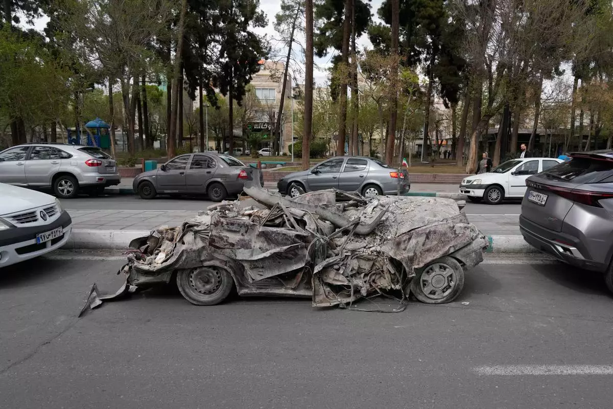 A damaged car is slotted between other vehicles after it was relocated from the area of a residential building that was hit in a U.S.-Israeli strike in Tehran, Friday, March 27, 2026. (AP Photo/Vahid Salemi)