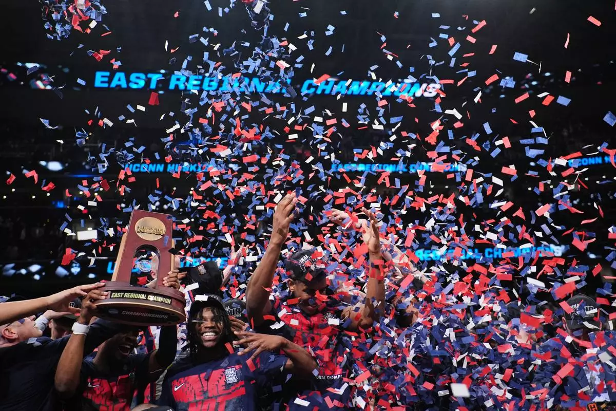 UConn players celebrate after their win against Duke in the Elite Eight of the NCAA college basketball tournament, Sunday, March 29, 2026, in Washington. (AP Photo/Abbie Parr)