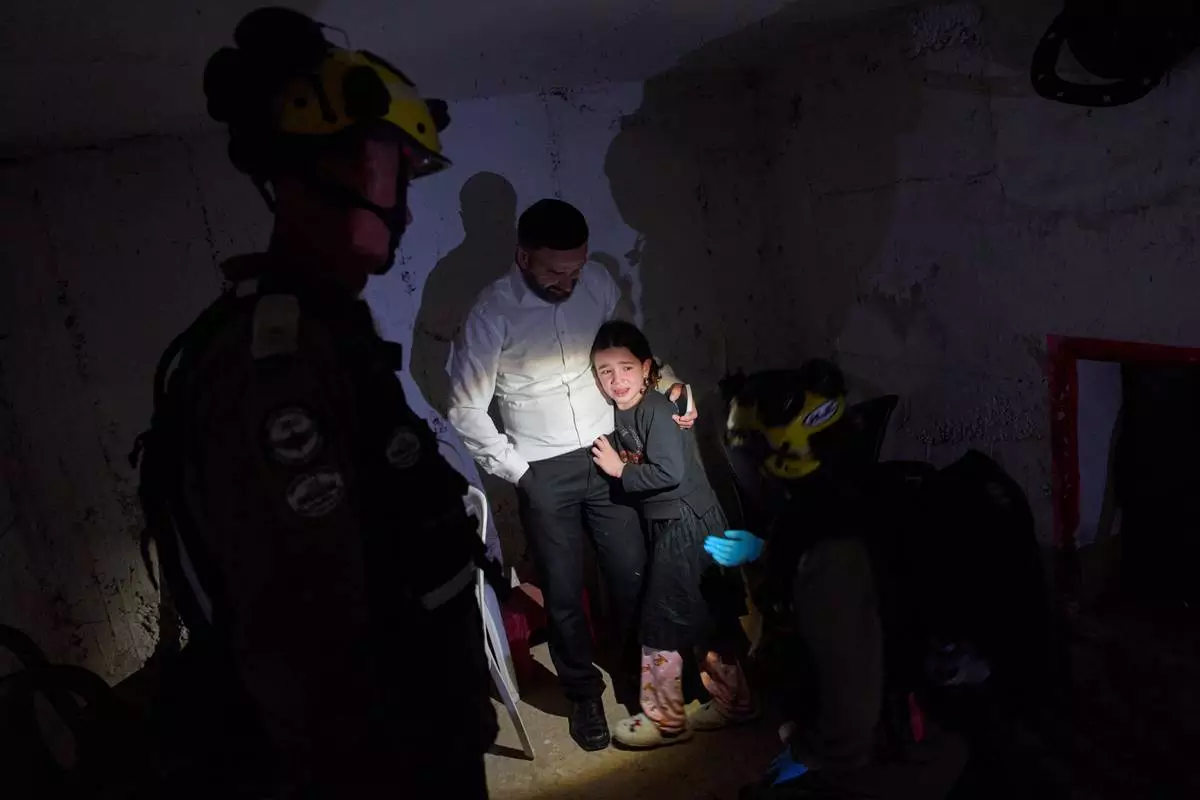 A young girl is comforted by her father and Israeli soldiers as they take cover in a bomb shelter during air raid sirens warning of incoming Iranian missile strikes in Bnei Brak, Israel, Wednesday, April 1, 2026. (AP Photo/Oded Balilty)