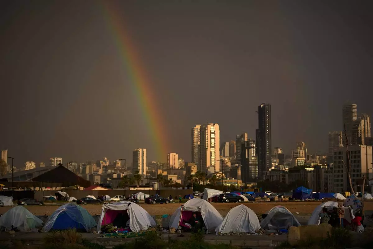 Displaced people who fled Israeli strikes in southern Lebanon sit inside tents used as shelters as a rainbow breaks through the rain in Beirut, Lebanon, Sunday, March 29, 2026. (AP Photo/Emilio Morenatti)