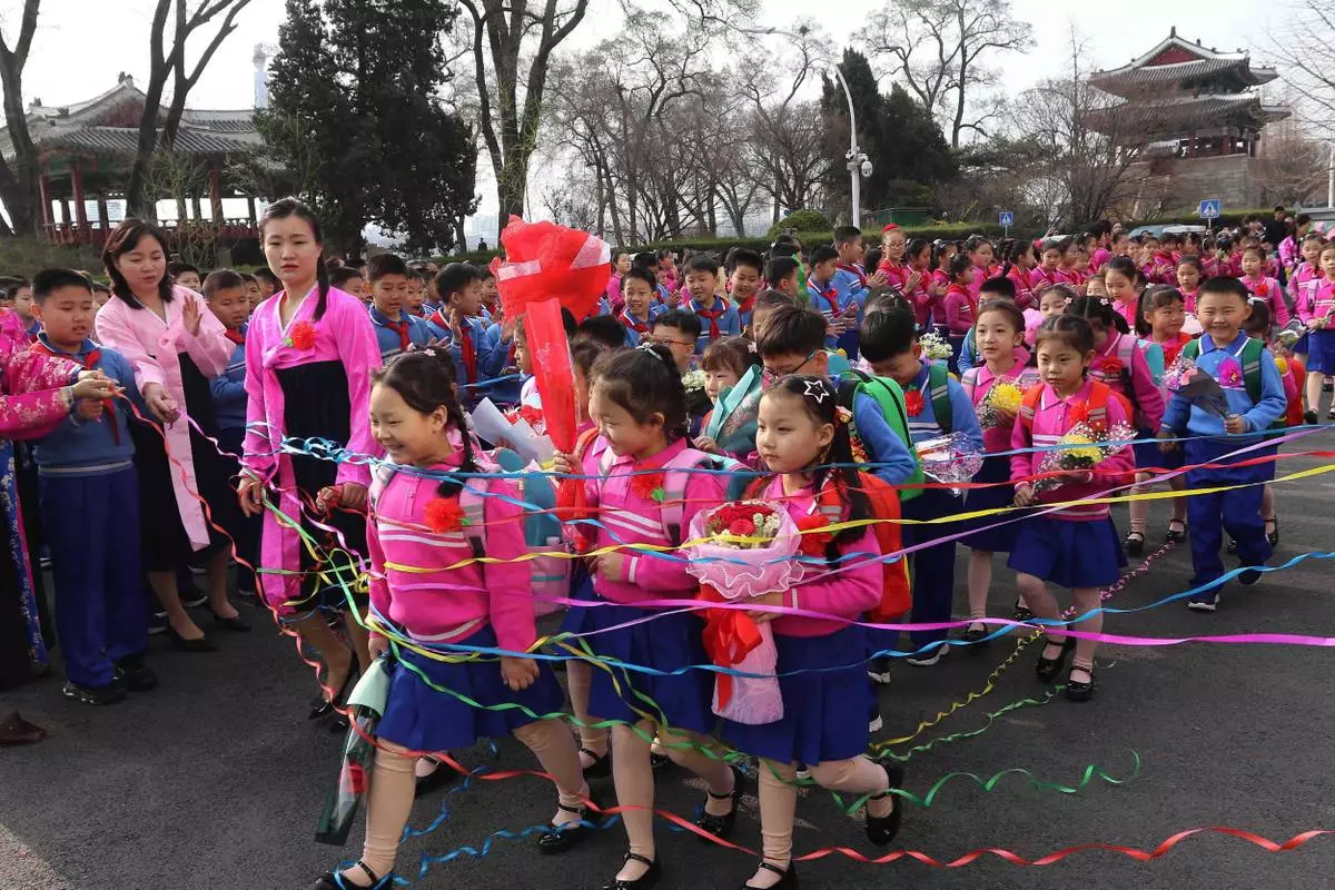Newly enrolled pupils are welcomed by students, teachers and others during a school-opening ceremony at Kim Song Ju Primary School in Pyongyang, North Korea Wednesday, April 1, 2026. (AP Photo/Cha Song Ho)