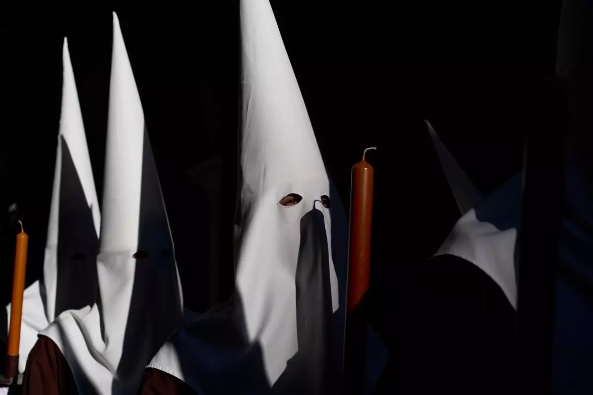 Hooded penitents of the Franciscana de Pasion brotherhood take part during a Holy Week procession in Lucena, southern Spain, Monday, March 30, 2026. (AP Photo/Manu Fernandez)