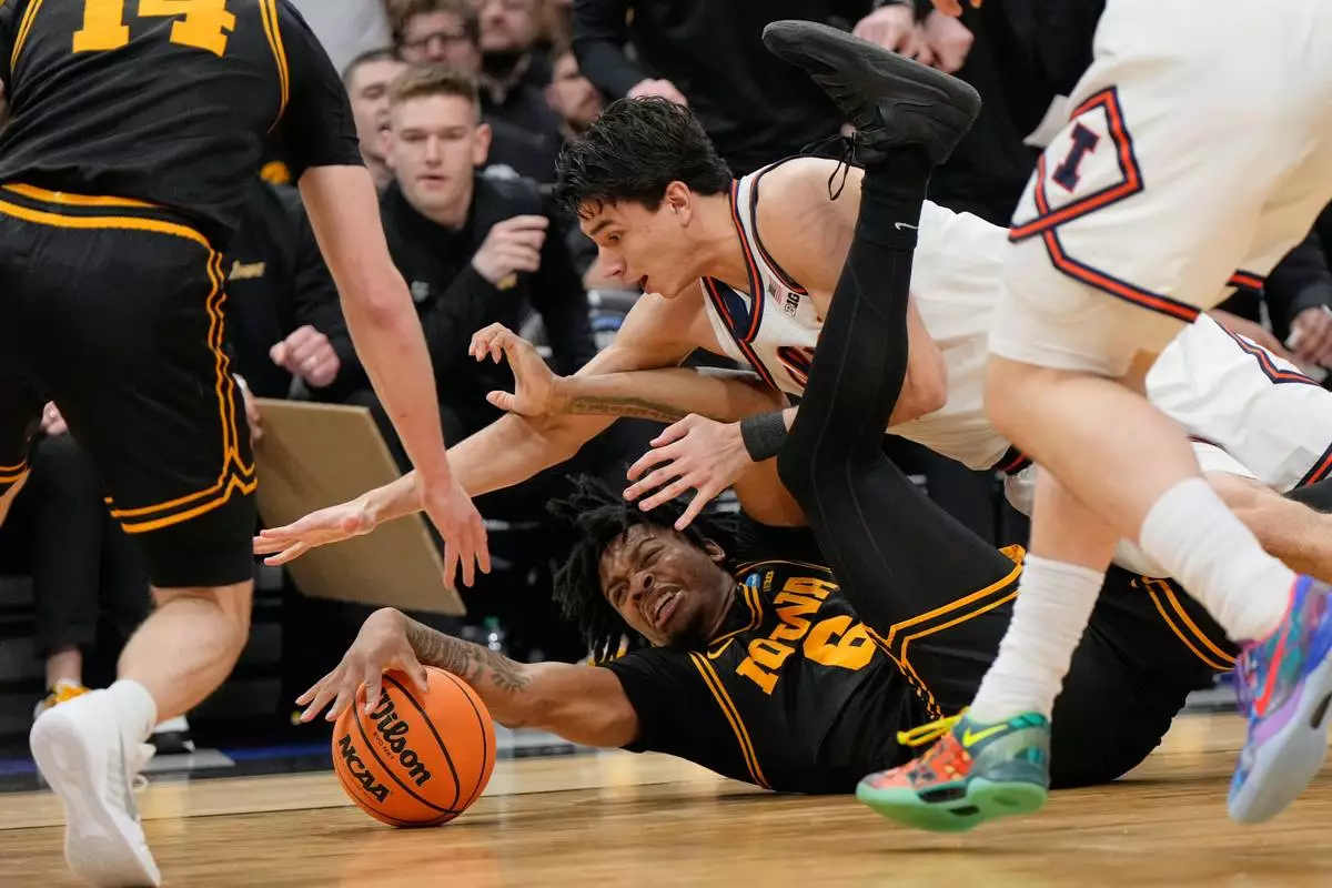 Iowa's Tavion Banks (6) and Illinois' Andrej Stojakovic battle for a loose ball during the first half of an Elite Eight game in the NCAA college basketball tournament Saturday, March 28, 2026, in Houston. (AP Photo/Ashley Landis)