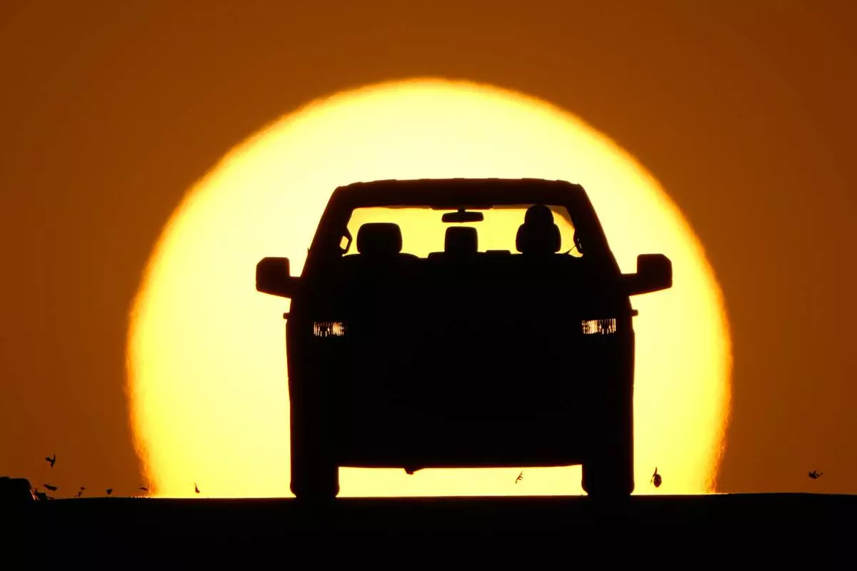 A motorist is silhouetted by the setting sun as the region hit a high temperature to tie a record for the hottest day in March in the area, Thursday, March 26, 2026, in Lenexa, Kan. (AP Photo/Charlie Riedel)