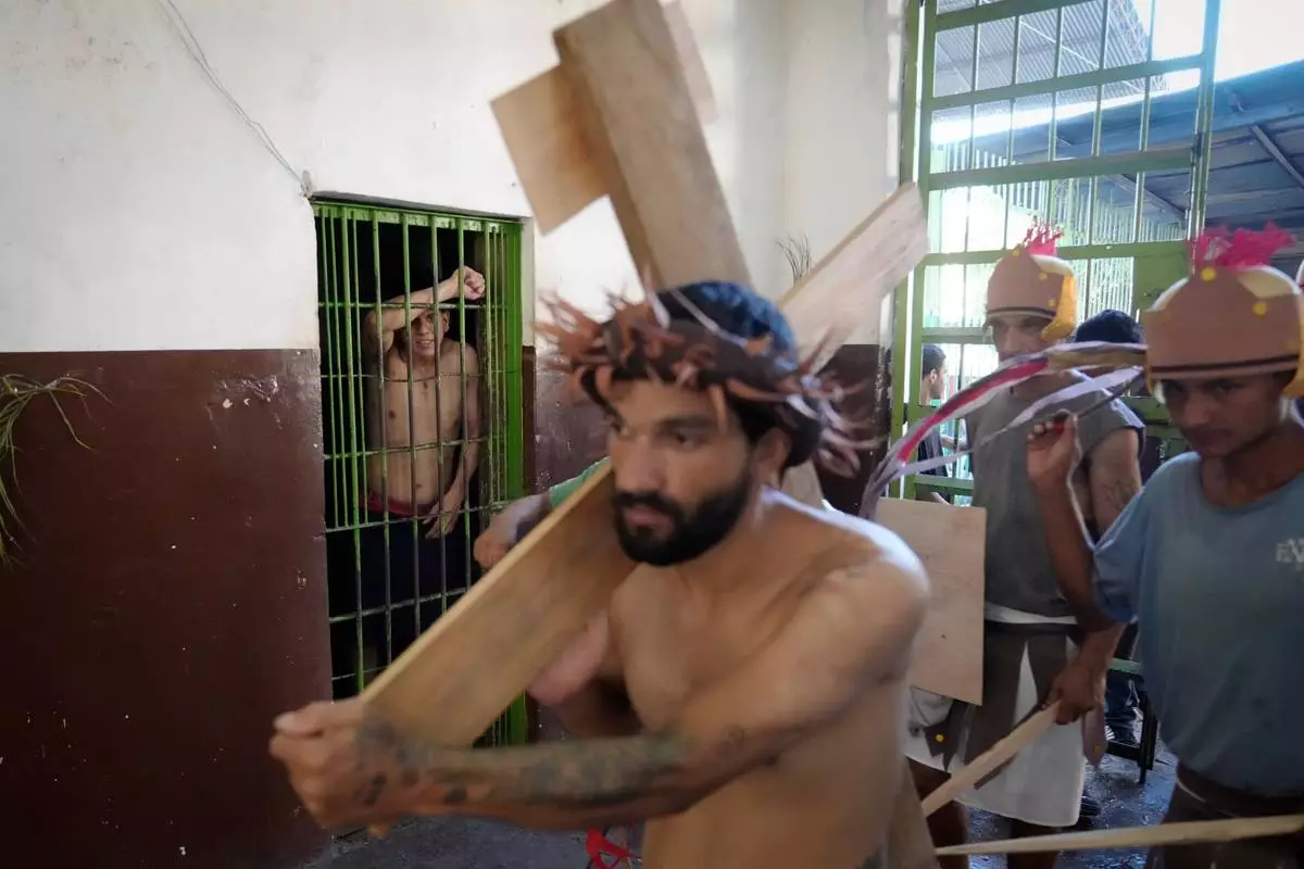 Inmates perform a Stations of the Cross reenactment at Tacumbu prison in Asuncion, Paraguay, Tuesday, March 31, 2026. (AP Photo/Jorge Saenz)