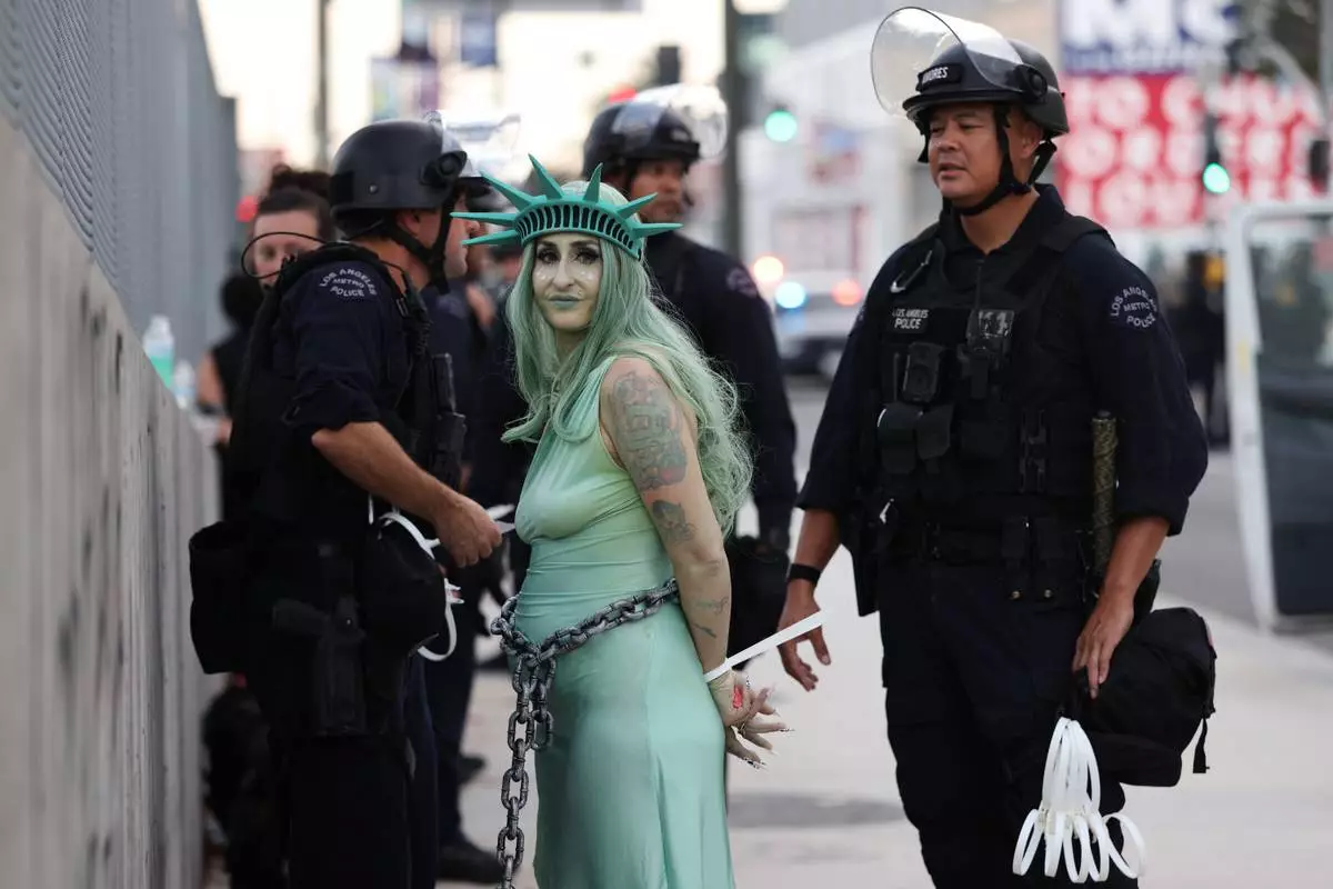 Police arrest a protestor dressed as the Statue of Liberty in downtown Los Angeles after the "No Kings" rally Saturday, March 28, 2026. (AP Photo/Jill Connelly)