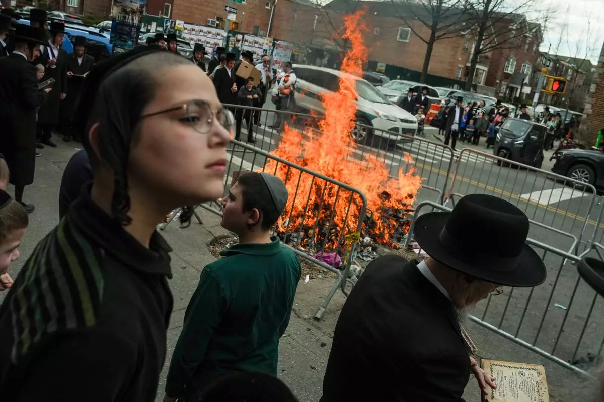 People stand near a fire during "biur chametz," a Jewish ritual where leavened food items are burned on the morning ahead of Passover, Wednesday, April 1, 2026, in New York. (AP Photo/Ryan Murphy)