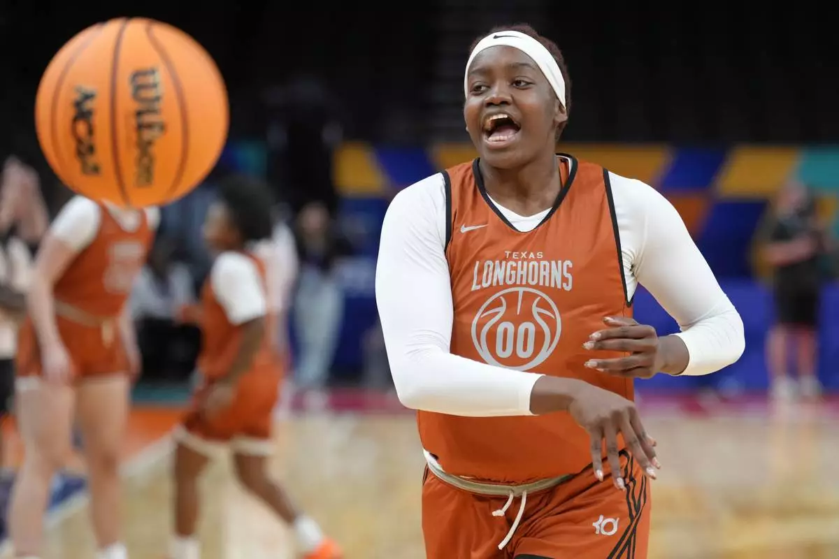 Texas center Kyla Oldacre passes the ball during practice prior to the national semifinals Women's Final Four of the NCAA college basketball tournament, Thursday, April 2, 2026, in Phoenix. (AP Photo/Ross D. Franklin)