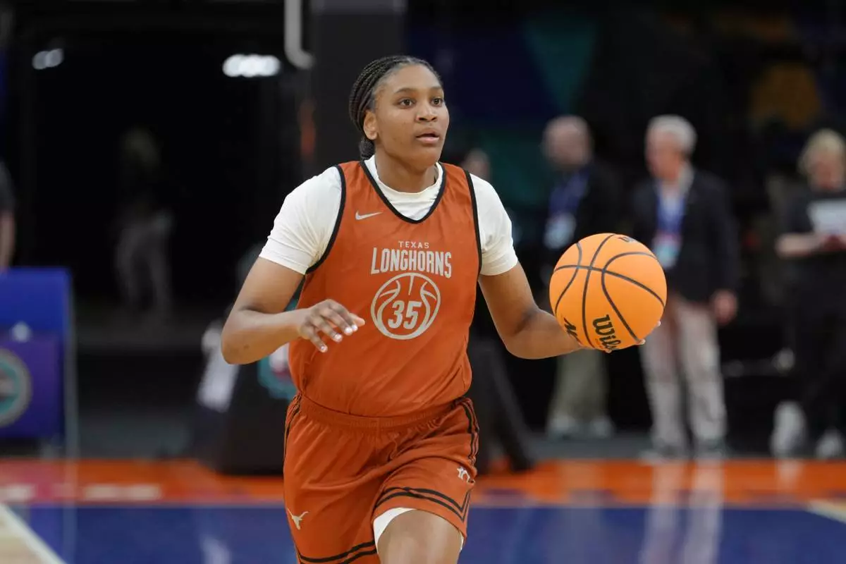 Texas forward Madison Booker dribbles the ball during practice prior to the national semifinals Women's Final Four of the NCAA college basketball tournament, Thursday, April 2, 2026, in Phoenix. (AP Photo/Ross D. Franklin)