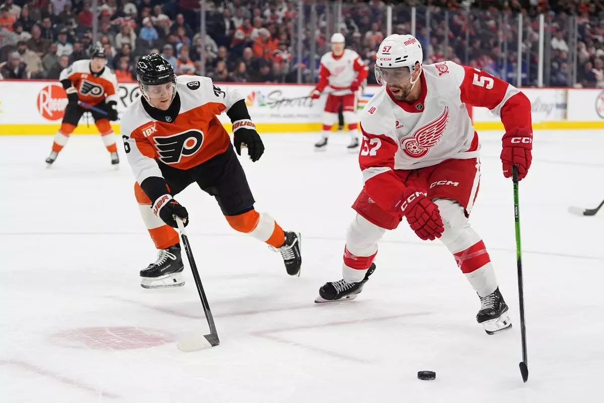 Detroit Red Wings' David Perron (57) tries to skate past Philadelphia Flyers' Emil Andrae, front left, during the first period of an NHL hockey game, Thursday, April 2, 2026, in Philadelphia. (AP Photo/Matt Rourke)