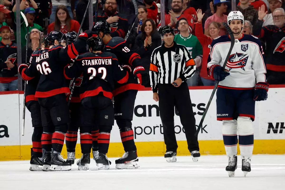 In the third meeting between the teams in less than 2½ weeks, Stankoven scored 2:27 into the game on a deflection in front of Merzlikins on Carolina’s first shot of the game. Stankoven's 17th goal of the season – adding to his career-high total – came at 8:52 when he tapped in a loose puck in the crease.