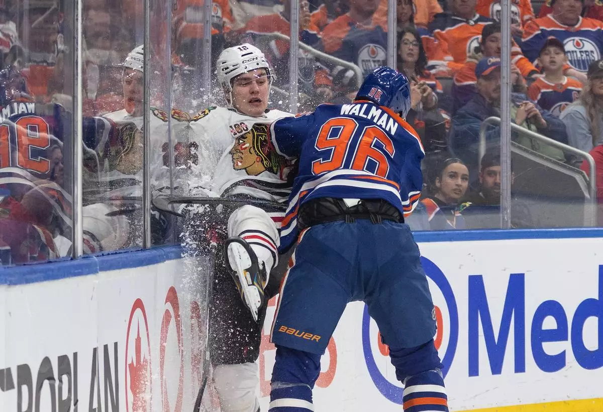Chicago Blackhawks' Anton Frondell (16) is checked by Edmonton Oilers' Jake Walman (96) during the first period of an NHL hockey game in Edmonton, Alberta, on Thursday April 2, 2026. (Jason Franson/The Canadian Press via AP)
