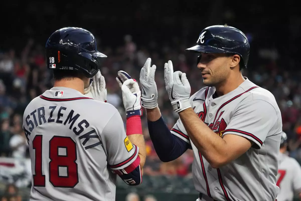 Atlanta Braves' Matt Olson celebrates with Mike Yastrzemski (18) after hitting a solo home run against the Arizona Diamondbacks in the first inning of a baseball game, Thursday, April 2, 2026, in Phoenix. (AP Photo/Rick Scuteri)