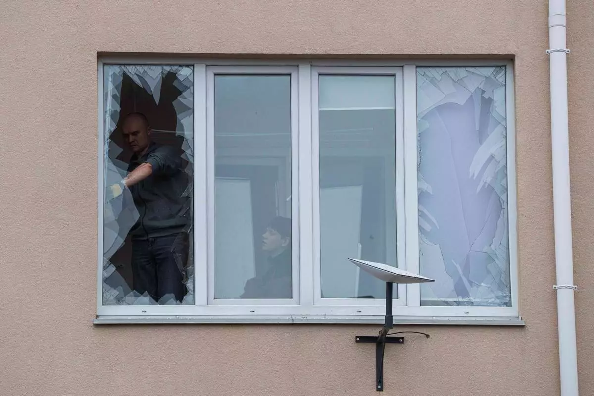 People remove broken glass from their windows after a Russian strike on residential neighbourhood in Kriukivshchyna, Kyiv region, Ukraine, on Friday, April 3, 2026. (AP Photo/Evgeniy Maloletka)