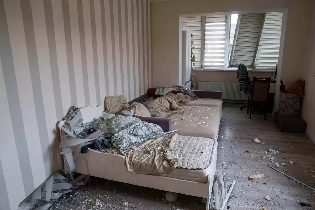 Broken glass is seen on beds at an which was damaged after a Russian strike on residential neighbourhood in Kriukivshchyna, Kyiv region, Ukraine, on Friday, April 3, 2026. (AP Photo/Evgeniy Maloletka)