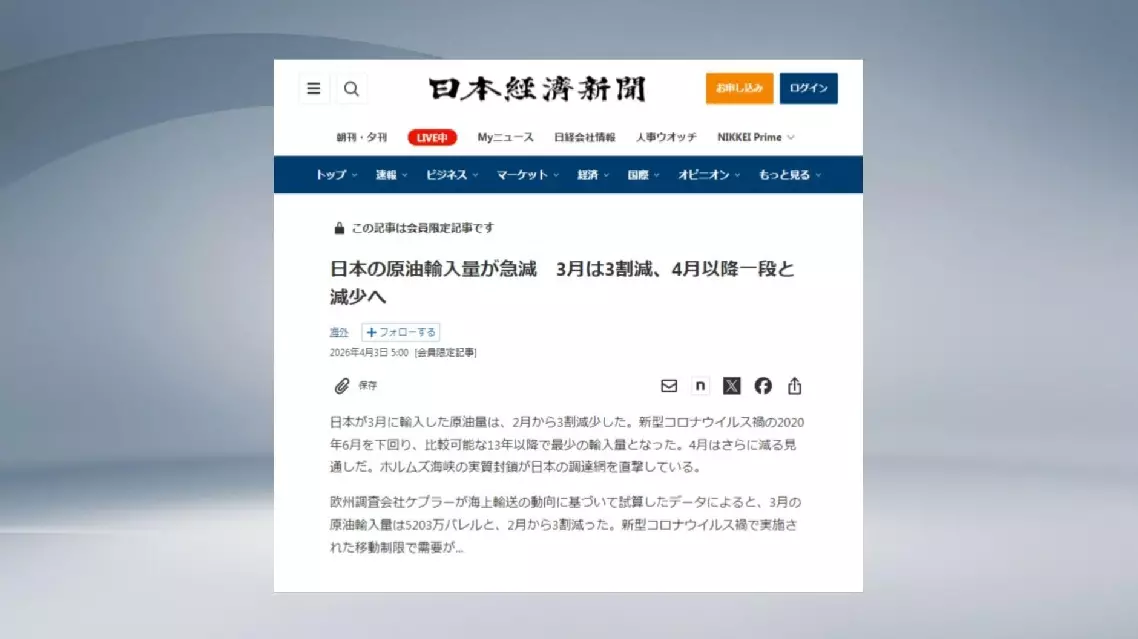 The report said statistics from Kpler, a data and analytics platform, showed that Japan imported 52.03 million barrels of crude oil in March, down roughly 30 percent from the previous month. The Nikkei said Kpler's figure also demonstrated that Japan's crude oil imports highly depended on producers in the Gulf region in March.