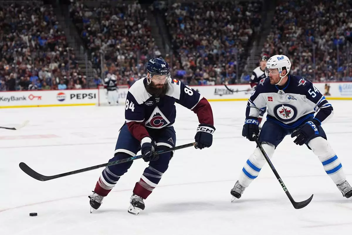 Colorado Avalanche defenseman Brent Burns, left, drives past Winnipeg Jets defenseman Dylan Samberg in the third period of an NHL hockey game Saturday, March 28, 2026, in Denver. (AP Photo/David Zalubowski)