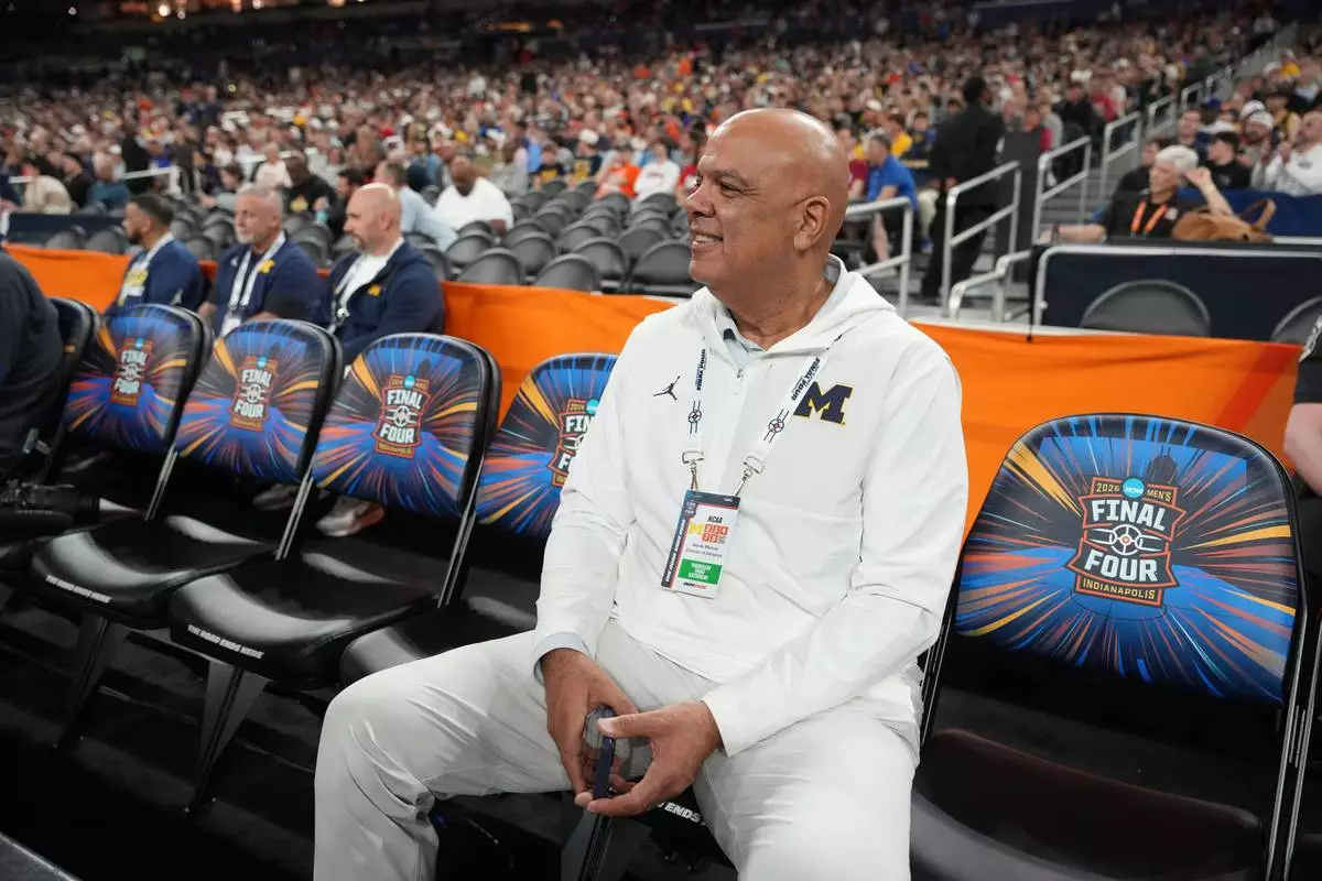 Michigan athletic director Warde Manuel watches Michigan practice ahead of an NCAA college basketball tournament semifinal game against Arizona at the Final Four, Friday, April 3, 2026, in Indianapolis. (AP Photo/Michael Conroy)