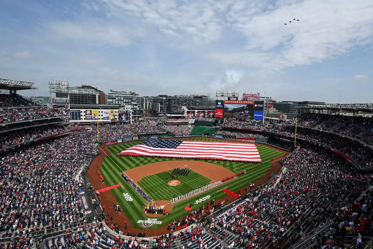 An American flag is held across the field during the national anthem as F-16C Fighting Falcons flyover before the Washington Nationals home-opener baseball game against the Los Angeles Dodgers, Friday, April 3, 2026, in Washington. (AP Photo/Terrance Williams)
