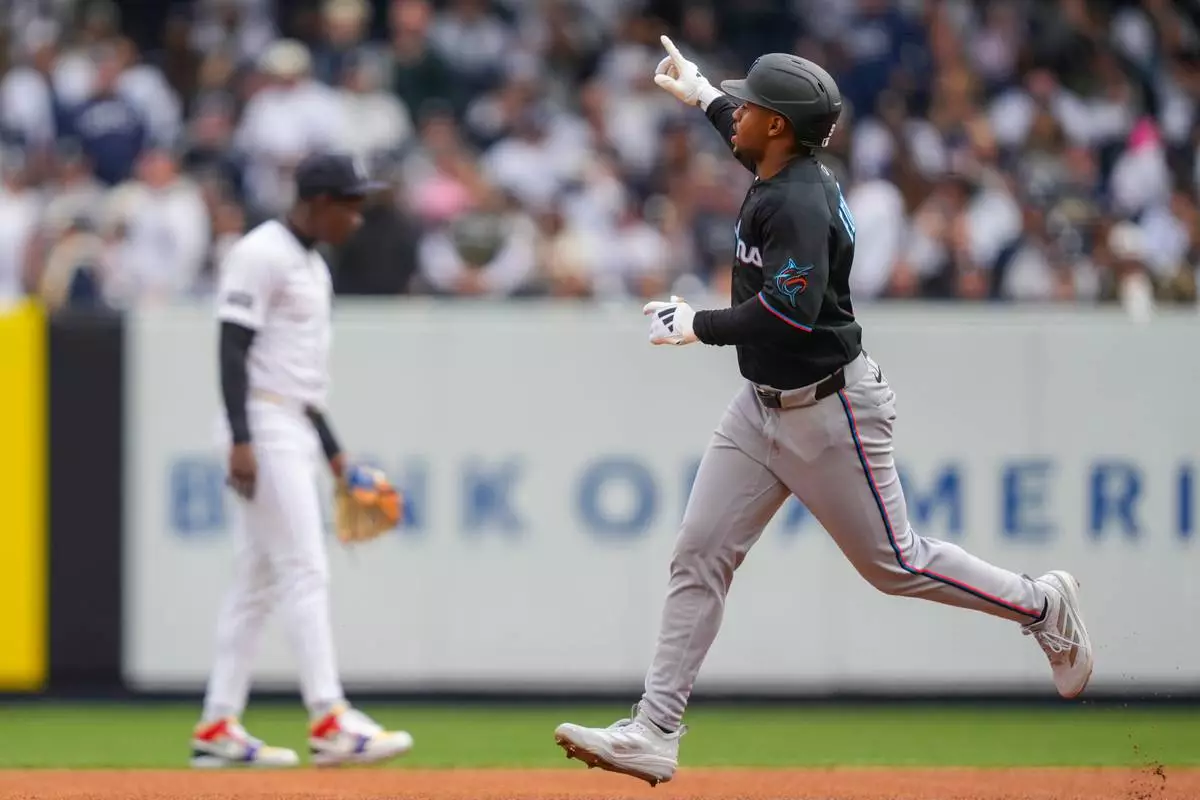 Miami Marlins' Xavier Edwards (9) rounds the bases after hitting a home run during the first inning of the New York Yankees' home-opener baseball game, Friday, April 3, 2026, in New York. (AP Photo/Yuki Iwamura)