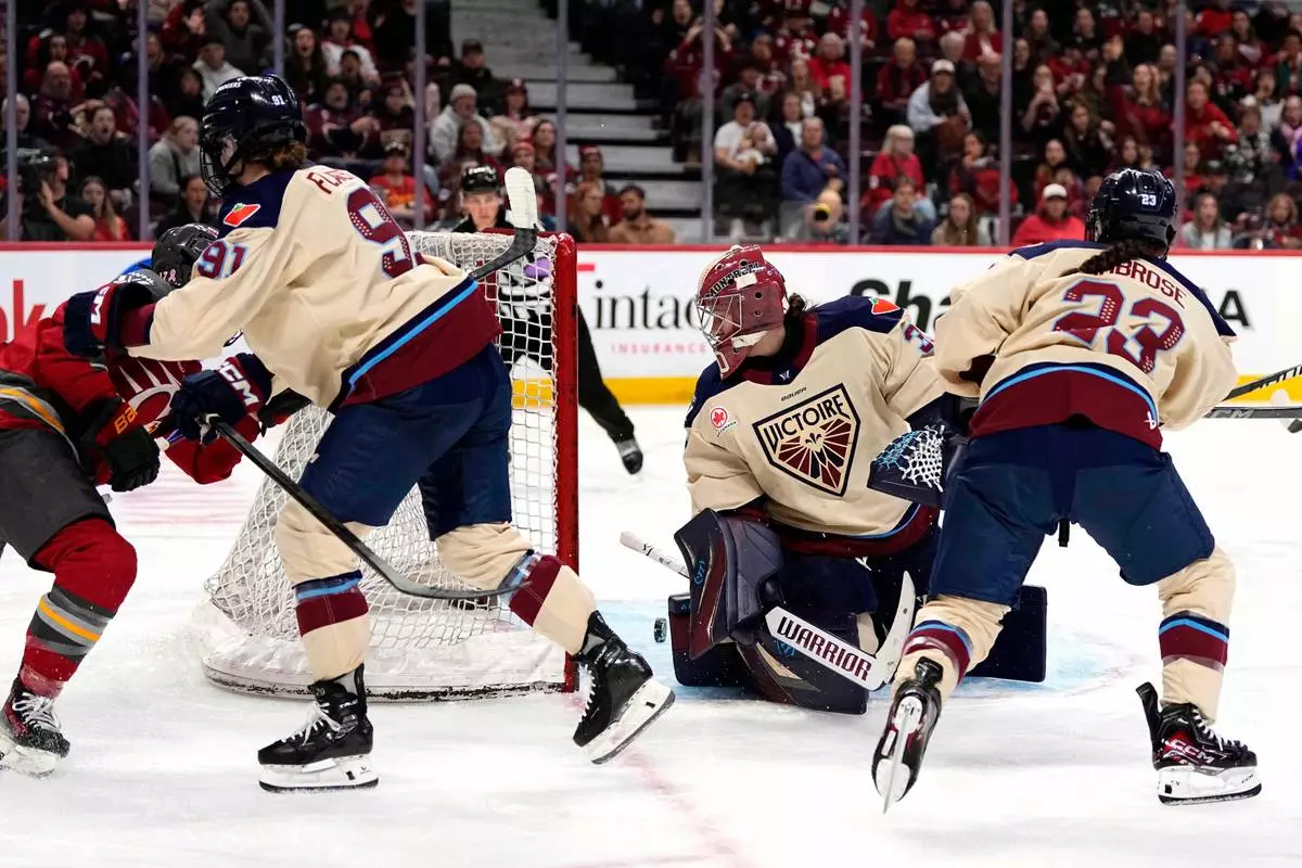 The puck rolls through the crease of Montreal Victoire goaltender Sandra Abstreiter, second from right, off a shot by Ottawa Charge's Gabbie Hughes, left, during third-period PWHL hockey game action in Ottawa, Ontario, Friday, April 3, 2026. (Justin Tang/The Canadian Press via AP)