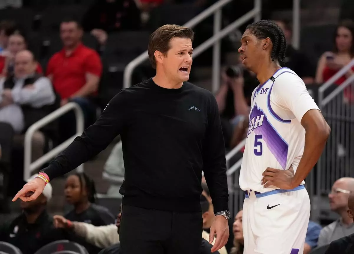 Utah Jazz head coach Will Hardy, left, talks with forward Cody Williams (5) during the first half of an NBA basketball game against the Houston Rockets, Friday, April 3, 2026, in Houston. (AP Photo/Karen Warren)