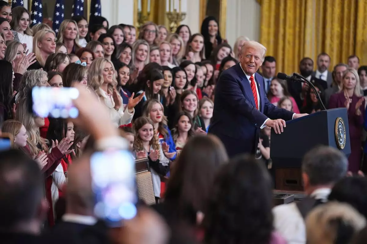 FILE - Women and girls listen to President Donald Trump speak before he signs an executive order barring transgender female athletes from competing in women's or girls' sporting events, in the East Room of the White House, Feb. 5, 2025, in Washington. (AP Photo/ Evan Vucci, File)