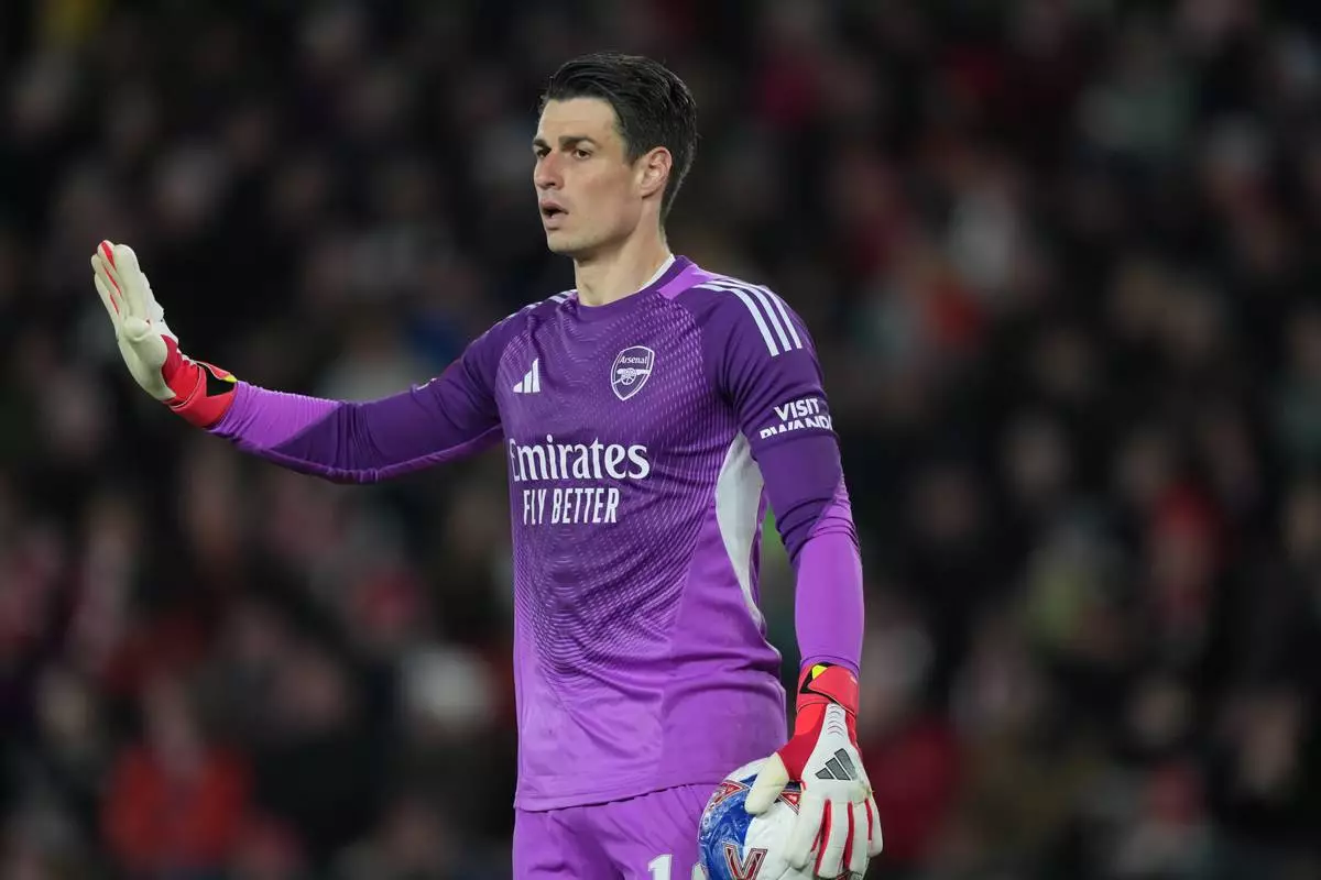 Arsenal's goalkeeper Kepa Arrizabalaga gestures during the English FA Cup quaterfinal soccer match between Southampton and Arsenal in Southampton, England, Saturday, April 4, 2026. (AP Photo/Dave Shopland)