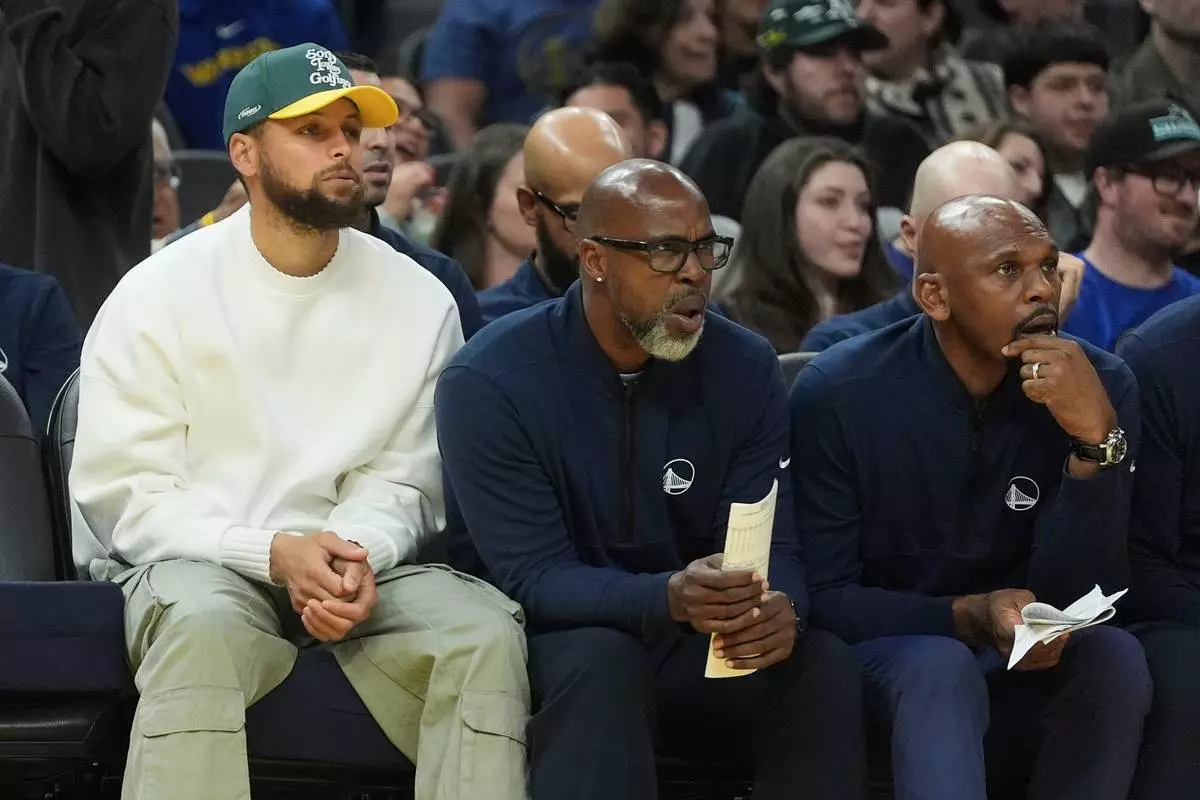 Injured Golden State Warriors guard Stephen Curry, left, watches from the bench with assistant coaches Kris Weems, middle, and Jerry Stackhouse during the first half of an NBA basketball game against the Cleveland Cavaliers in San Francisco, Thursday, April 2, 2026. (AP Photo/Jeff Chiu)