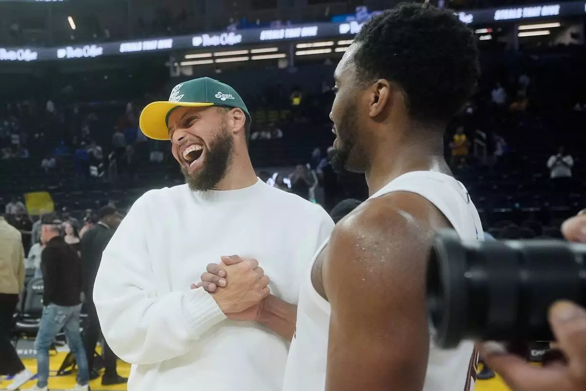 Golden State Warriors guard Stephen Curry, left, smiles while shaking hands with Cleveland Cavaliers guard Donovan Mitchell after an NBA basketball game in San Francisco, Thursday, April 2, 2026. (AP Photo/Jeff Chiu)